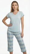 Blusa unicolor manga corta cuello "v" con estampado localizado punto corazón; capri elaborado en tela con fibras de algodón, de tacto suave con estampación digital