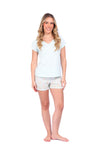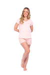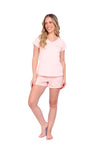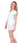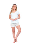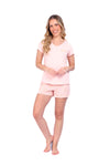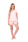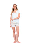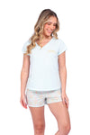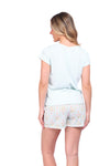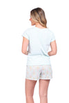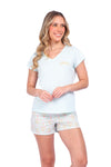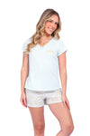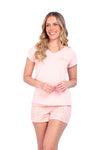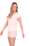Blusa unicolor manga corta, cuello "v" con estampado localizado punto corazón; short elaborado en tela con fibras de algodón, de tacto suave con estampación digital