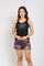 Blusa unicolor sisa con estampado localizado en técnica especial, short elaborado en textil suave, elástico y de apariencia acanalada con estampación digital.