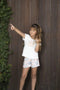 Blusa unicolor de cargaderas y escote en encaje, short en tela piel de durazno con estampación digital de tacto extra suave.