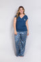 Blusa unicolor manga corta cuello V, con estampado localizado, short en tela piel de durazno con estampación digital de tacto extra suave.