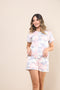 ¡Siéntete cómoda y fresca con nuestro Pijama mujer en suave y elástico tejido. Nuestro set incluye una blusa con bolero y tirantes anchos, y un short amplio con bolsillos funcionales. La estampación digital le da un tacto suave y moderno. ¡No querrás quitártelo nunca!