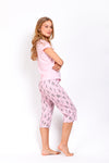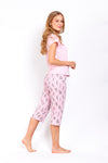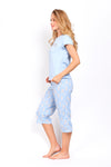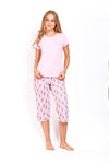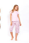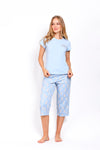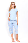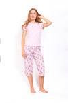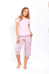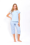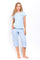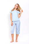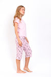 Con un diseño práctico y femenino, esta pijama combina una blusa unicolor de cuello redondo con un capri suave y liviano que se adapta a tu ritmo. El estampado sutil y los bolsillos funcionales suman estilo y comodidad, haciendo de este set tu aliado favorito para descansar con libertad y frescura.
