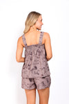 Set elaborado con una mezcla suave de poliéster, algodón y spandex para una experiencia ligera, flexible y envolvente. La textura del short ofrece una sensación sedosa ideal para climas cálidos, y su diseño estampado suma un toque moderno y divertido.