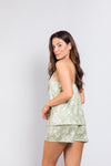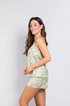 Set elaborado con una mezcla suave de poliéster, algodón y spandex para una experiencia ligera, flexible y envolvente. La textura del short ofrece una sensación sedosa ideal para climas cálidos, y su diseño estampado suma un toque moderno y divertido.