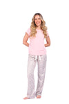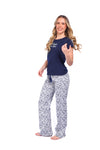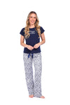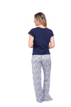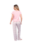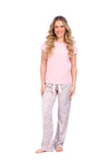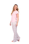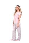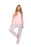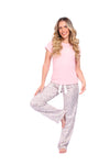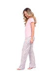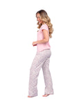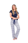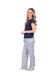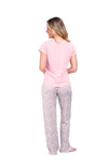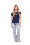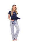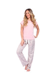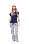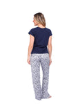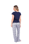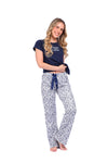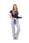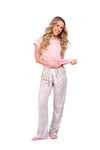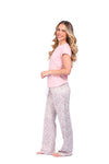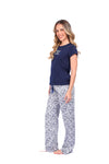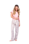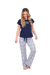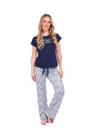 Blusa unicolor manga corta con estampado localizado; pantalón en tela de microfibra liviana, de tacto suave con estampación digital, moño decorativo en cintura