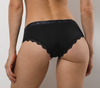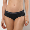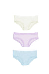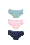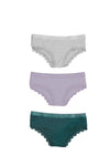 Trio de panties en silueta tipo cachetero con elástico en cintura y encaje delgado y suave en piernas que brindan mayor ajuste, elaborados en tela unicolor con elongación, de tacto suave y fresco con refuerzo interno en tela con fibras de algodón