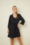 Batola elaborada en tejido plano satín, de tacto frío y extra suave con estampación digital, de silueta amplia con carderas anchas y detalle de nudo en escote.