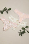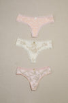 Trio de panties en silueta tipo tanga con encaje delgado y suave en cintura y sesgo elástico en piernas que brinda mayor ajuste y adaptabilidad a los movimientos, elaborados en tela piel de durazno con estampación digital, de tacto suave y fresco con refuerzo interno con fibras de algodón.