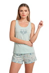 Blusa unicolor manga sisa con estampado localizado; short elaborado en tela con fibras de algodón, de tacto suave con estampación digital. Cinta decorativa en cintura de short.